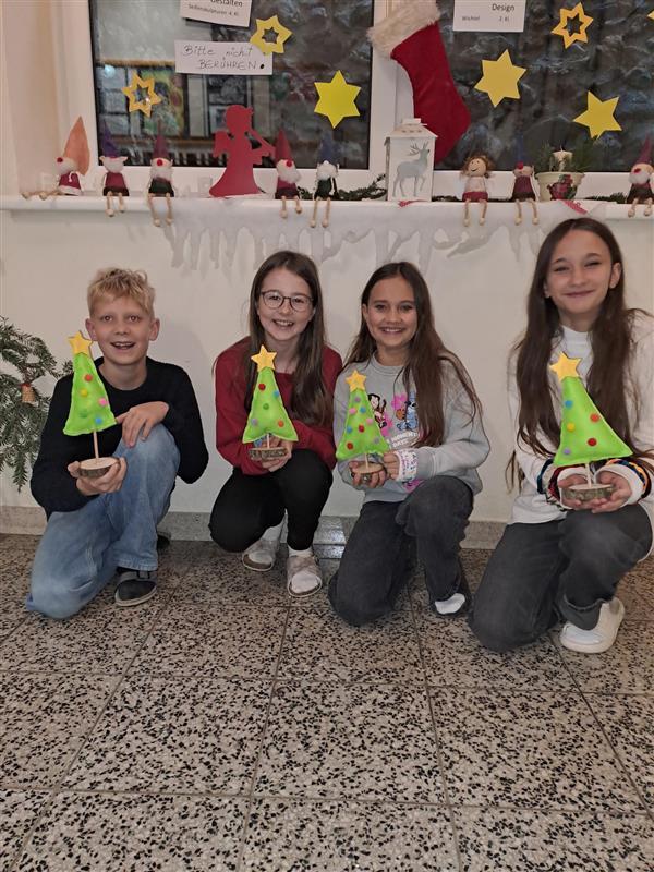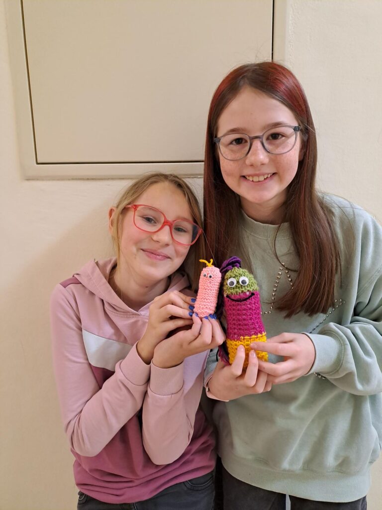 Anja und Clara mit ihren selbstgestrickten Antistresspüppchen.